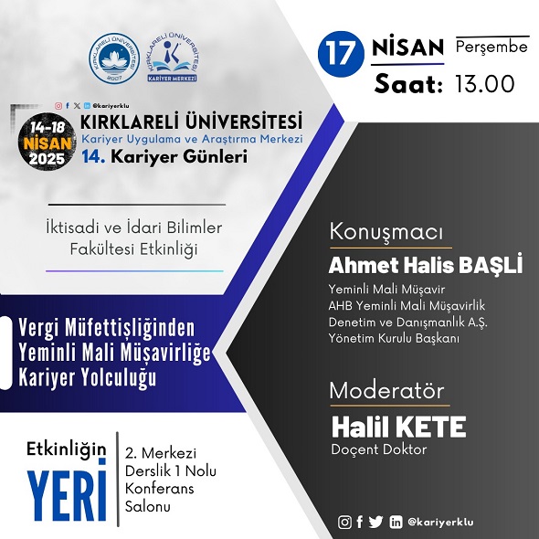 İktisadi ve idari bilimler alanında eğitim gören öğrenciler, kariyerlerini doğru adımlarla çizmek için iş dünyasıyla buluştu. Kırklareli Üniversitesi Kariyer Uygulama ve Araştırma Merkezi’nin düzenlediği 14. Kariyer Günleri’nde kürsüye çıkan Yeminli Mali Müşavir Ahmet Halis Başli, vergi müfettişliğinden mali müşavirliğe uzanan bir kariyer için ipuçlarını paylaştı.